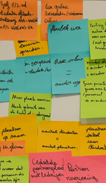 Om tot een oplossing te bekomen kregen we eerst uitleg over een manier om te brainstormen. Tijdens deze manier van brainstormen schrijft ieder teamlid gedurende enkele minuten een aantal ideeën op. Nadat de tijd verstreken is, vertelt iedereen wat ze hebben opgeschreven, waarna iedereen korte feedback geeft. Het is belangrijk om de feedback kort te houden, zodat de duur van de brainstormingsessie minimaal blijft.