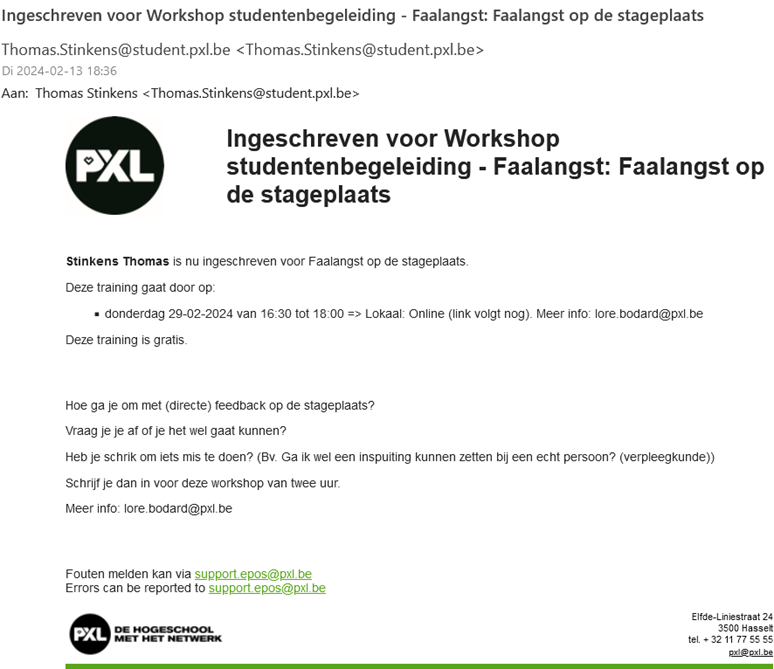 Het eerste stuk bewijsmateriaal is een screenshot van de mail die mijn inschrijving voor de activiteit bevestigde.