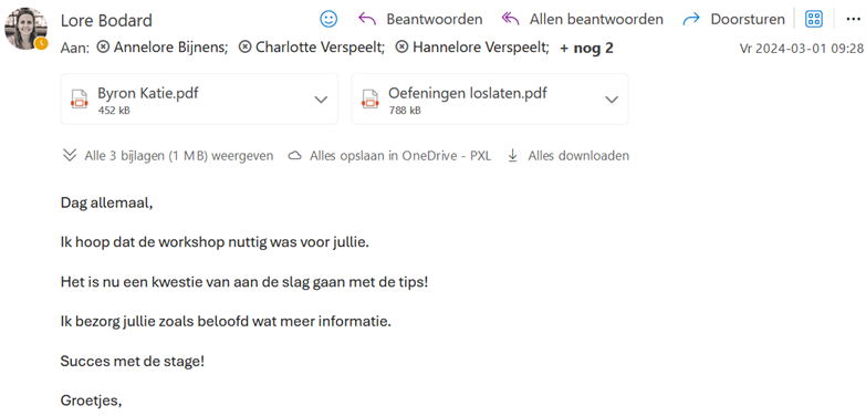 Als laatste bewijsstuk toon ik een bericht dat elke persoon, die effectief had deelgenomen aan de sessie, kreeg na afloop. In dit bericht kregen we enkele documenten die besproken waren tijdens de activiteit.